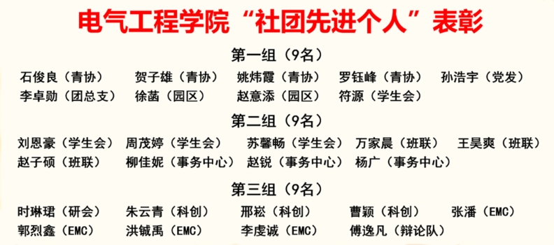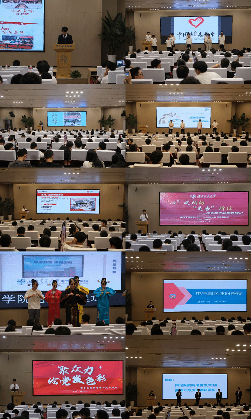 2024年6月14日19:00,91成人 2023-2024学年“聚青年之力·塑电气先锋”社团风采展示暨团学骨干表彰大会于犀浦校区图书馆二号报告厅举办。本次活动由91成人 团委主办,91成人 学生会及团总支承办。学院团委书记张异老师,学院学生社团(组织)学生会、青年志愿者协会、媒体事务中心(EMC)、班级联合会(学业发展指导中心)、大学生科技活动中心、学生事务中心、研究生会、园区自我管理委员会、党员发展服务中心、辩论队、团总支共11个社团(组织)的指导老师及骨干成员们参加会议。
