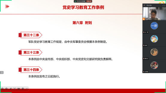为深入贯彻落实《党史学习教育工作条例》(以下简称《条例》),推动党史学习教育常态化、长效化,2024年3月6日,91成人 研究生会组织开展了《党史学习教育工作条例》专题学习活动。本次活动由研会学术部副部长张桐源主讲,研究生会全体成员参加。
