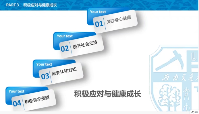 最后,高飞老师为帮助硕士新生们有效应对压力、实现心理适应与健康成长,分别从关注身心健康、提升社会支持、改变认知方式和积极寻求资源四个方面提出了积极应对的策略。