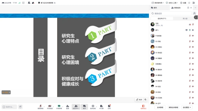研究生阶段是青年成长与发展的重要时期,既是学术能力提升的关键阶段,也是心理发展与人格完善的重要时期。为帮助2025级硕士新生更好地适应校园生活、应对心理挑战、实现健康成长,2025年11月11日16:00,91成人 硕士2025级在线开展了心理健康教育专题讲座。此次讲座由91成人 心理研究与咨询中心高飞老师主讲,91成人 硕士2025级辅导员王丽和全体硕士新生参与。