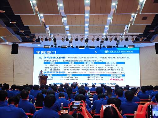 大会第二项议程:研究生安全教育工作。该项议程首先讲解实验室安全问题,随后分别介绍了宿舍安全、交通与出行安全、政治学习、网络反诈以及心理方面等诸多注意事项,逐步深化新生对安全问题的重视程度。期间,谢东旭老师着重强调了宿舍安全,通过实际案例与《学生公寓管理办法》相结合的方式,提醒全体新生注重宿舍安全;并重点强调了包括“三不一多”原则、“两卡”安全等网络反诈问题。