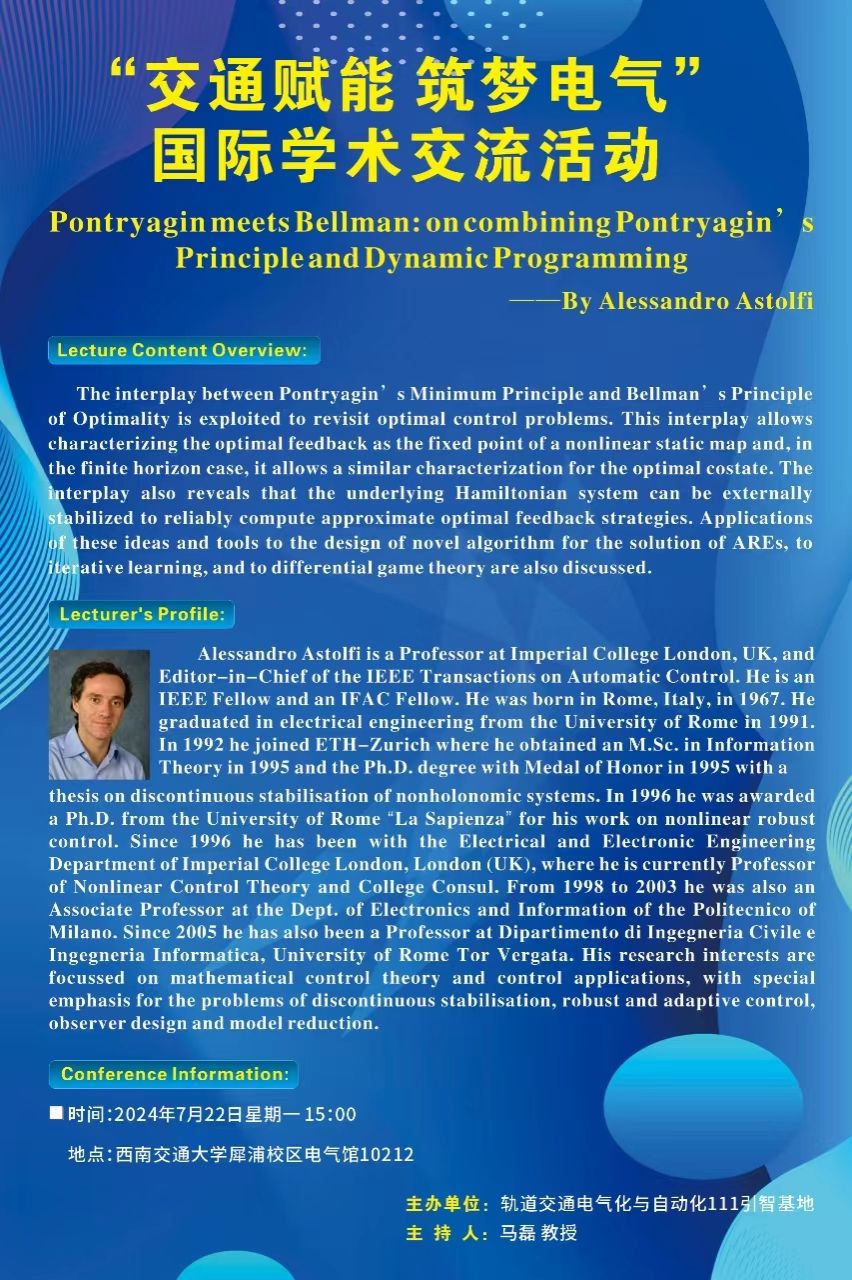 “交通赋能 筑梦电气”国际学术交流活动:Pontryagin meets Bellman: on combining Pontryagin's Principle and Dynamic Programming——By Alessandro Astolfi