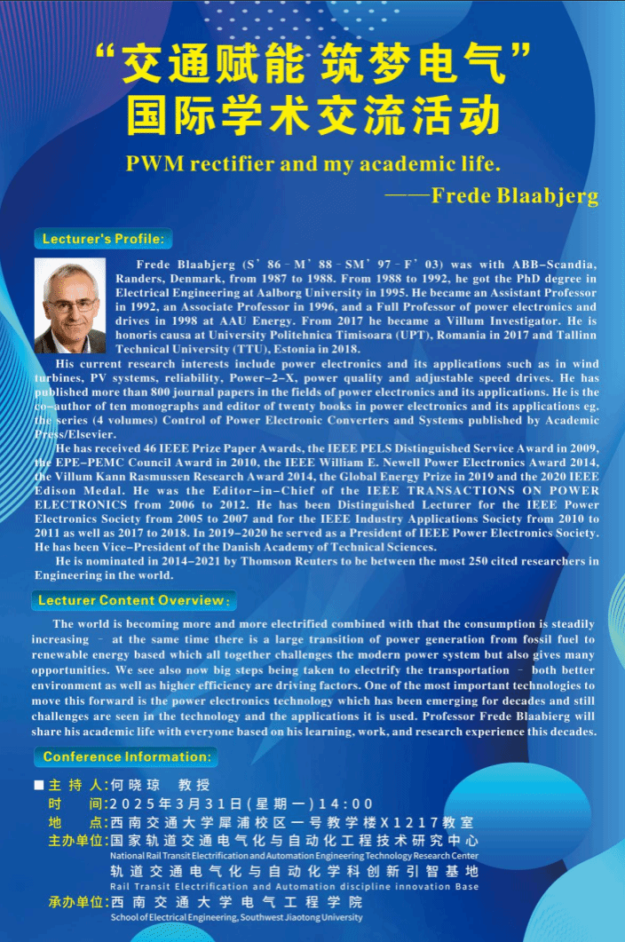 The world is becoming more and more electrified combined with that the consumption is steadily increasing – at the same time there is a large transition of power generation from fossil fuel to renewable energy based which all together challenges the modern power system but also gives many opportunities. We see also now big steps being taken to electrify the transportation – both better environment as well as higher efficiency are driving factors. One of the most important technologies to move this forward is the power electronics technology which has been emerging for decades and still challenges are seen in the technology and the applications it is used. Professor Frede Blaabierg will share his academic life with everyone based on his learning, work, and research experience this decades.