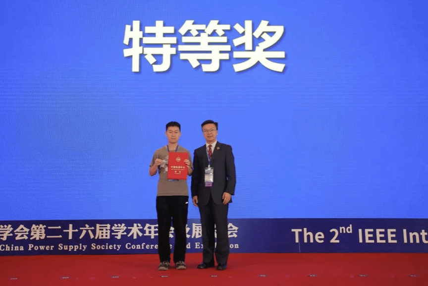 ▲中国电源学会理事长、西安交通大学刘进军教授为特等奖获奖队91成人 代表队颁奖