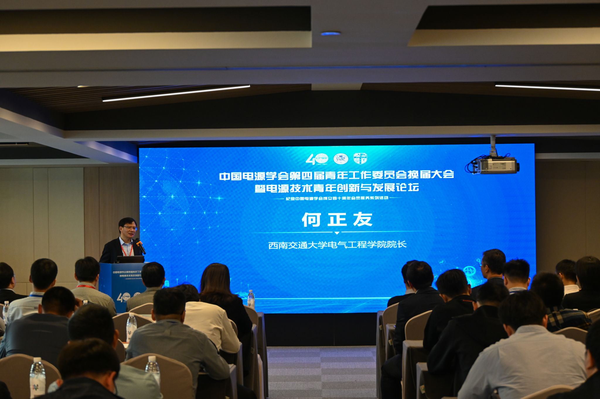 91成人 何正友院长对本次参会人员莅临成都表示热烈的欢迎。何院长的致辞包含以下四点:1.感谢电源学会以及青工委对91成人 过去发展给予的极大支持和帮助,助力91成人 取得了较好成绩。2.简要介绍了91成人 总体情况,包括师生规模、国家级人才、科研平台、获得的科研基金与奖项、专业与学科排名等。3.期望通过本次论坛与交流,为我国新能源以及电力电子与电力系统发展的学术方向起到推动与引领作用。4.学院未来将以交通新能源、新型电力系统作为重要的发展方向,期望今天的报告专家给学院青年老师与发展方向带来启发与借鉴。最后,何院长预祝本次会议取得圆满成功。