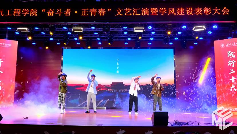 紧接着是电气茅班的舞蹈《青春旋律》。舞者们轻快的身姿,勾勒出青春的多彩。在充满律动的音乐中,观众们充分感受到了他们的阳光向上,欢快的气氛遍布整个会场,将晚会推向了另一个高潮。