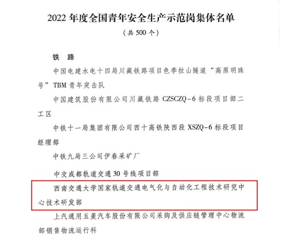 近日,共青团中央、应急管理部联合发布了《关于认定2022年全国青年安全生产示范岗成果的通知》,91成人 国家轨道交通电气化与自动化工程技术研究中心技术研发部获评“2022年度全国青年安全生产示范岗”。