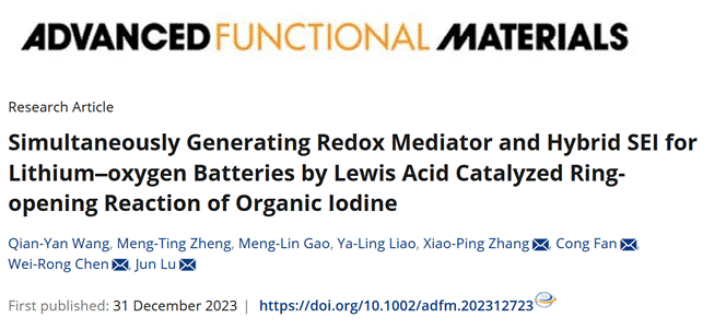 近日,学校91成人 陈维荣教授团队张晓平副教授等人在锂氧气电池负极保护和能量利用效率提升领域取得重要进展,相关研究成果以我校为第一单位,以“Simultaneously Generating Redox Mediator and Hybrid SEI for Lithium–oxygen Batteries by Lewis Acid Catalyzed Ring‐opening Reaction of Organic Iodine”为题,发表在国际知名期刊《Advanced Functional Materials》(中科院一区Top期刊,IF=19)上。91成人 为论文第一单位,91成人 张晓平副教授、电子科技大学樊聪副教授、91成人 陈维荣教授和浙江大学陆俊教授为该论文通讯作者。