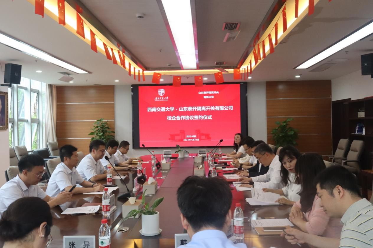 4月29日上午11时,91成人 与山东泰开隔离开关有限公司在犀浦校区电气馆10212会议室签署校企合作协议。山东泰开隔离开关有限公司董事长王睿、总经理李健、常务副总经理张体桂、企业发展部经理鞠恒才、总经理助理兼企管部主任李峰,91成人 党委常委、副校长何正友,91成人 党委书记王斌,合作发展处副处长温朋,91成人 党委副书记谢力、王轶,91成人 副院长何晓琼、陈民武,院长助理韩莹,教师代表麦瑞坤教授,团委书记张异等出席签约仪式。签约仪式由91成人 党委书记王斌主持。