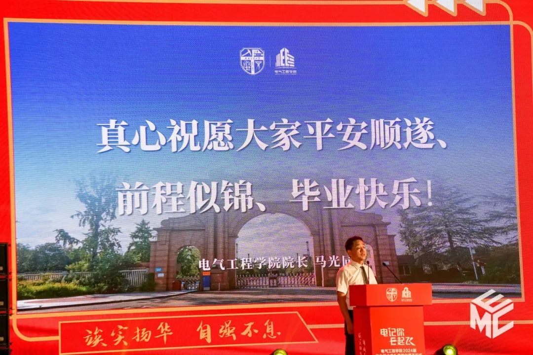 在讲话的最后,马光同院长表示,“厚德载物、求是创新”已成为电气学子的精神烙印,电气学子永远是学院的宝贵财富。学院近年来持续加强校友联络与服务工作,希望毕业生们奔赴全国各地后能及时与当地校友会取得联系。一生电气人、一世电气情,学院永远是毕业生们的坚强后盾和精神家园。