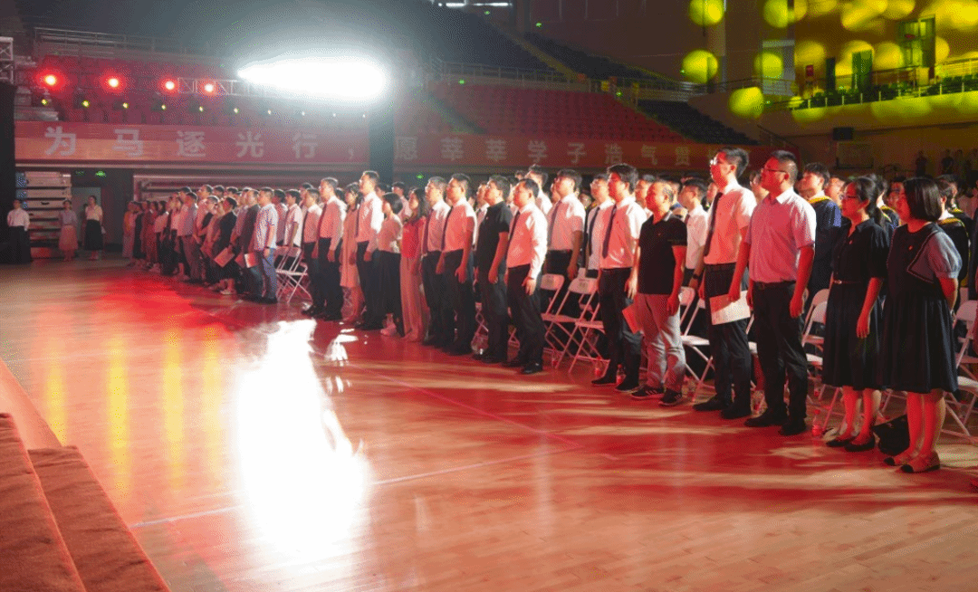 在庄严的国歌声中,毕业典礼拉开帷幕。全体师生面向国旗行注目礼,并齐唱国歌。