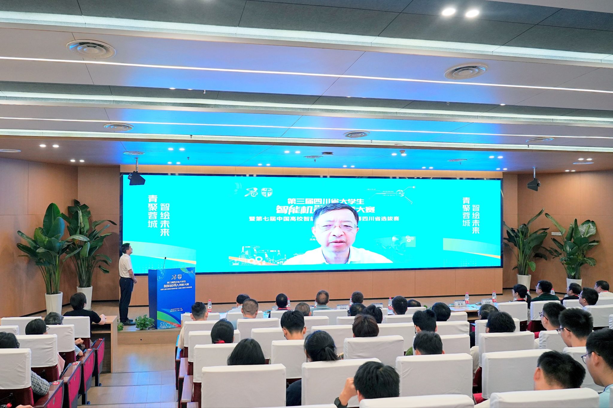中国高校智能机器人创意大赛专家委员会秘书长顾大强教授以视频形式向大家致辞。顾大强教授首先对大赛的开幕表示衷心祝贺,对关心和支持大赛发展的四川省各高校表示衷心感谢。顾大强教授提到,中国高校智能机器人创意大赛始创于2017年,至今已经连续举办六年,今年的比赛规模尤甚以往,希望同学们能够在比赛中提升实践能力、培养创新思维,为社会发展添砖加瓦。