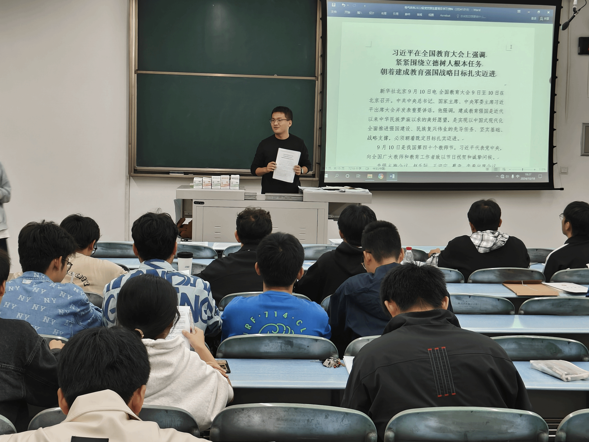 本科2024级党支部于10月15日开展学习贯彻全国教育大会精神主题党日并重温入党誓词。支部书记艾效天带领全体党员共同学习习近平总书记在全国教育大会上的重要讲话精神。与会学生党员结合自己当下的学习状态与规划,分享了感想与体会,纷纷表示要坚持学思践悟,提升政治素养,锤炼品德修为,不断增强本领。