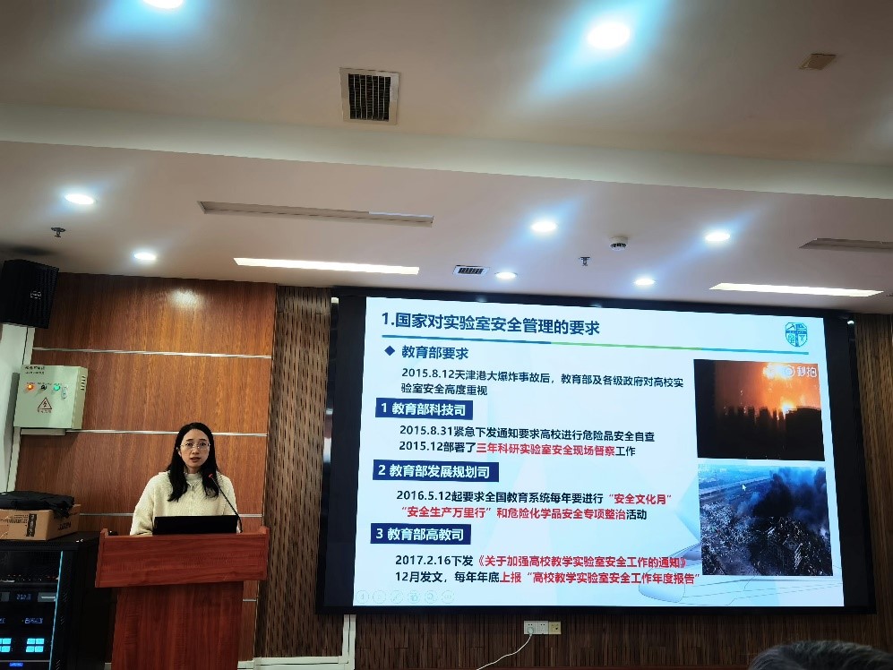 国有资产与实验室管理处安全科赵春花老师开展实验室安全培训。她详细介绍了国家对实验室安全管理的严格要求,阐述了学校实验室安全管理的具体工作,介绍了学校实行的“统一领导、分级负责、责任到人”的三级管理模式。她聚焦于安全隐患,通过列举插线板乱接、实验室物品堆放杂乱等常见问题,提醒师生在日常工作和学习中要时刻警惕这些安全隐患,鼓励大家积极参与学校实验室安全教育宣传活动,增强安全意识和自我保护能力。
