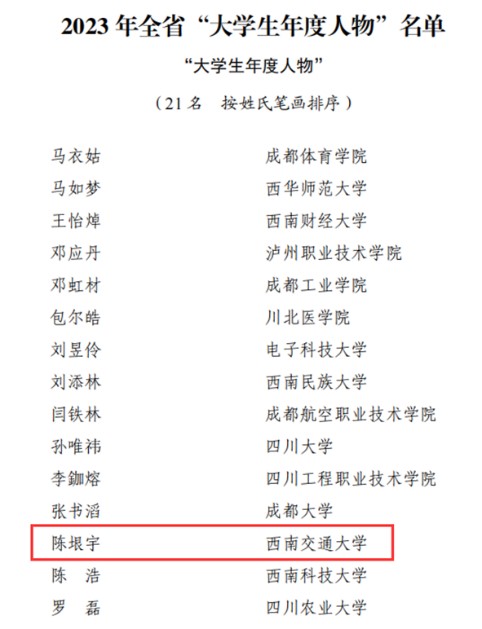 陈垠宇获评四川省2023年“大学生年度人物”荣誉称号