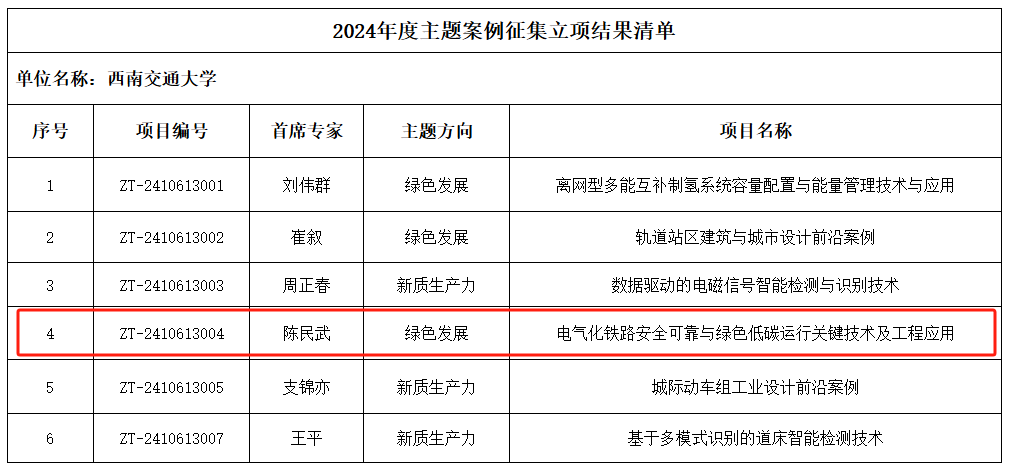 近日,教育部学位与研究生教育发展中心公布了2024年度主题案例立项结果,我校共有6项主题案例成功获批。其中,91成人 陈民武教授担任首席专家申报的《电气化铁路安全可靠与绿色低碳运行关键技术及工程应用》(项目编号:ZT-2410613004)成功获批。