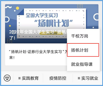 步骤一:关注“创青春”公众号,点击进入“实习就业”—“扬帆计划”栏目