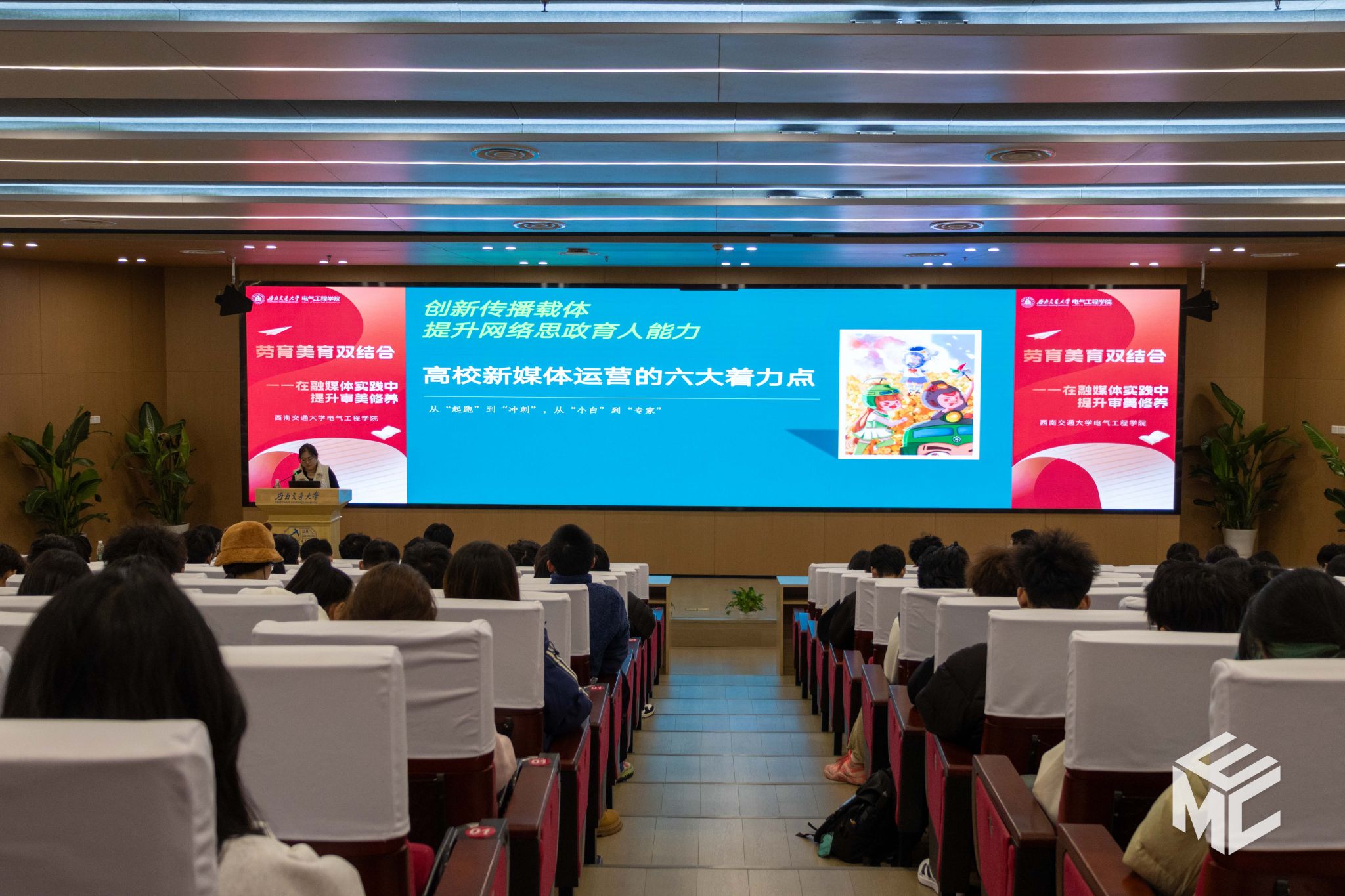 为探索“劳育”与“美育”在融媒体实践中的深度融合,提升学生骨干的新媒体运营能力与审美修养,11月20日晚,由91成人 团委主办、91成人 媒体事务中心(EMC)承办的2025年“劳育美育双结合——在融媒体实践中提升审美修养”第一期活动在犀浦校区图书馆一号报告厅顺利举行。活动特邀91成人 党委宣传部新媒体中心主任朱莹燕老师、91成人 党委宣传部(91成人)摄影师鞠红伟老师担任主讲嘉宾。活动由91成人 辅导员赵娜老师主持。